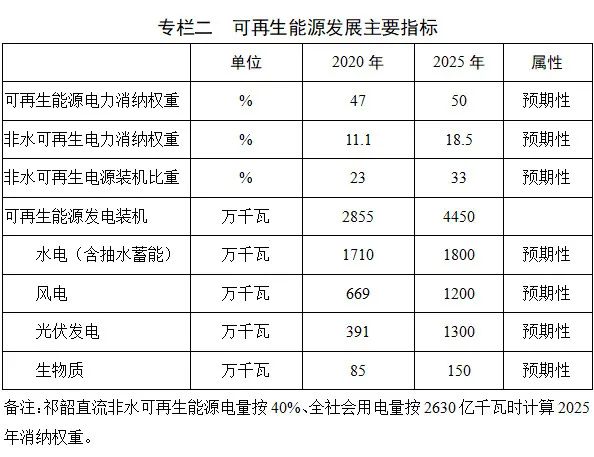 對(duì)標(biāo)國家總體目標(biāo),結(jié)合我省實(shí)際,在“十四五”期間努力實(shí)現(xiàn)可再生能源“綠色貢獻(xiàn)更大、利用領(lǐng)域更廣、使用成本更低、產(chǎn)業(yè)結(jié)構(gòu)更優(yōu)”的發(fā)展目標(biāo)。到2025年,可再生能源發(fā)電裝機(jī)規(guī)模達(dá)到約4450萬千瓦,其中水電1800萬千瓦,非水可再生能源2650萬千瓦,全省可再生能源電力消納責(zé)任權(quán)重穩(wěn)定在50%左右,非水可再生能源電力消納責(zé)任權(quán)重達(dá)到18.5%左右,非化石能源消費(fèi)占一次能源消費(fèi)總量的22%以上。