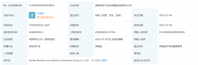 據(jù)企查查顯示信息,湖南有色產(chǎn)業(yè)投資集團(tuán)有限責(zé)任公司注冊(cè)資金為100億元,經(jīng)營(yíng)范圍包括經(jīng)營(yíng)范圍包含:礦產(chǎn)資源(非煤礦山)開(kāi)采;建設(shè)工程設(shè)計(jì);礦產(chǎn)資源勘查;金屬與非金屬礦產(chǎn)資源地質(zhì)勘探;測(cè)繪服務(wù);職業(yè)衛(wèi)生技術(shù)服務(wù);放射衛(wèi)生技術(shù)服務(wù);安全評(píng)價(jià)業(yè)務(wù);安全生產(chǎn)檢驗(yàn)檢測(cè);危險(xiǎn)廢物經(jīng)營(yíng);檢驗(yàn)檢測(cè)服務(wù);地質(zhì)災(zāi)害危險(xiǎn)性評(píng)估(依法須經(jīng)批準(zhǔn)的項(xiàng)目,經(jīng)相關(guān)部門(mén)批準(zhǔn)后方可開(kāi)展經(jīng)營(yíng)活動(dòng),具體經(jīng)營(yíng)項(xiàng)目以相關(guān)部門(mén)批準(zhǔn)文件或許可證件為準(zhǔn))一般項(xiàng)目:地質(zhì)勘查技術(shù)服務(wù);選礦;礦物洗選加工;再生資源加工;常用有色金屬冶煉;貴金屬冶煉;有色金屬鑄造;金屬礦石銷(xiāo)售;金屬材料銷(xiāo)售;新型金屬功能材料銷(xiāo)售;高性能有色金屬及合金材料銷(xiāo)售;新材料技術(shù)研發(fā);金屬?gòu)U料和碎屑加工處理;環(huán)保咨詢服務(wù);安全咨詢服務(wù);土壤污染治理與修復(fù)服務(wù);土壤環(huán)境污染防治服務(wù);水環(huán)境污染防治服務(wù);離岸貿(mào)易經(jīng)營(yíng);貿(mào)易經(jīng)紀(jì);國(guó)內(nèi)貿(mào)易代理;進(jìn)出口代理;工程和技術(shù)研究和試驗(yàn)發(fā)展;環(huán)境保護(hù)監(jiān)測(cè)等。