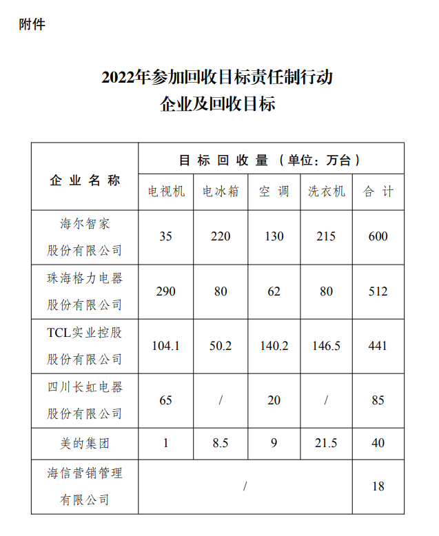 2022年5月,國家發(fā)展改革委辦公廳、工業(yè)和信息化部辦公廳、生態(tài)環(huán)境部辦公廳印發(fā)《關(guān)于做好2022年家電生產(chǎn)企業(yè)回收目標(biāo)責(zé)任制行動(dòng)有關(guān)工作的通知》,確定了6家開展2022年回收目標(biāo)責(zé)任制行動(dòng)的企業(yè)(見附件)。