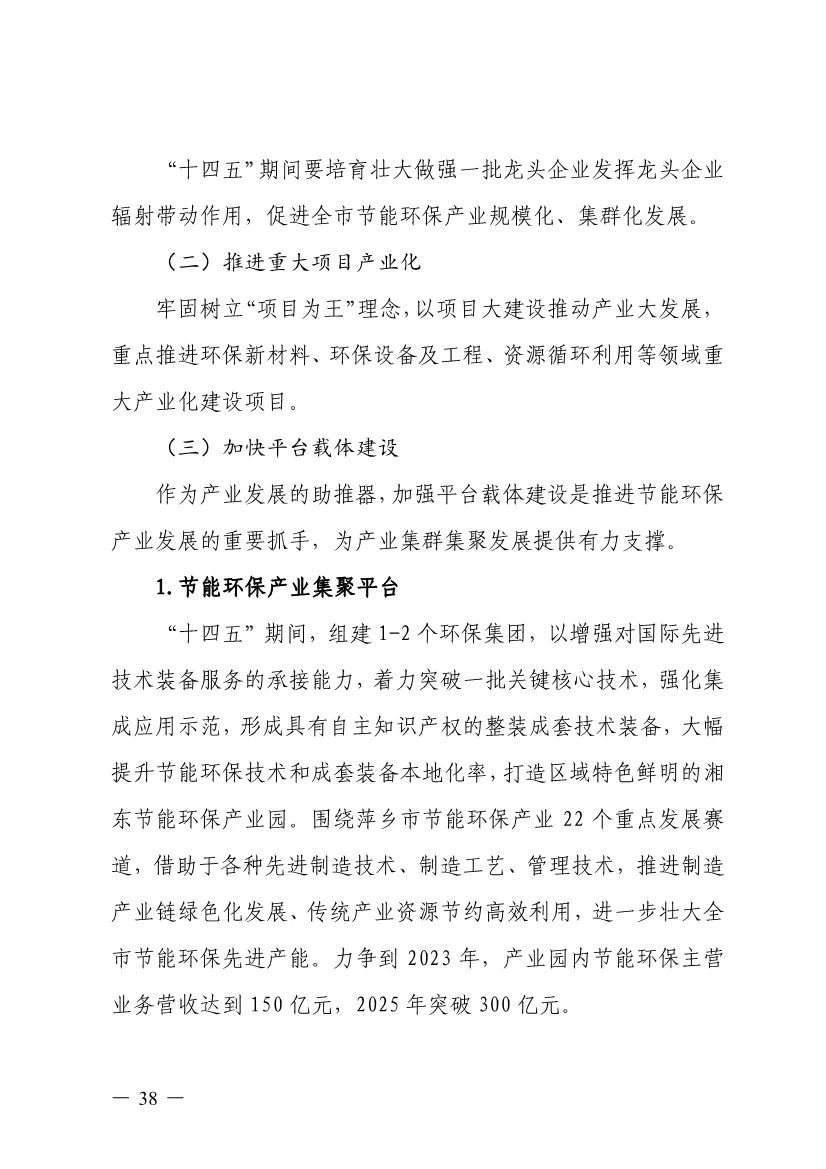 “十四五”期間,組建1-2個(gè)環(huán)保集團(tuán),以增強(qiáng)對(duì)國際先進(jìn)技術(shù)裝備服務(wù)的承接能力,著力突破一批關(guān)鍵核心技術(shù),強(qiáng)化集成應(yīng)用示范,形成具有自主知識(shí)產(chǎn)權(quán)的整裝成套技術(shù)裝備,大幅提升節(jié)能環(huán)保技術(shù)和成套裝備本地化率,打造區(qū)域特色鮮明的湘東節(jié)能環(huán)保產(chǎn)業(yè)園。