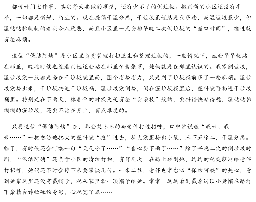 第三個付出,就是每天早晨七點到九點,晚上六點到八點要去定時去丟垃圾,這個時間雷打不動、刮風(fēng)下雨、過年過節(jié)、再忙再累,也都要去。很多時候都已經(jīng)到07:50了,才夫妻兩個人急急忙忙拎著4袋垃圾出門去丟,然后呢,還看到很多人和我們一起拎著垃圾袋沖向垃圾箱。這也是很重要的一個時間付出吧。
