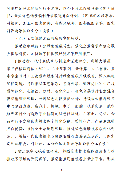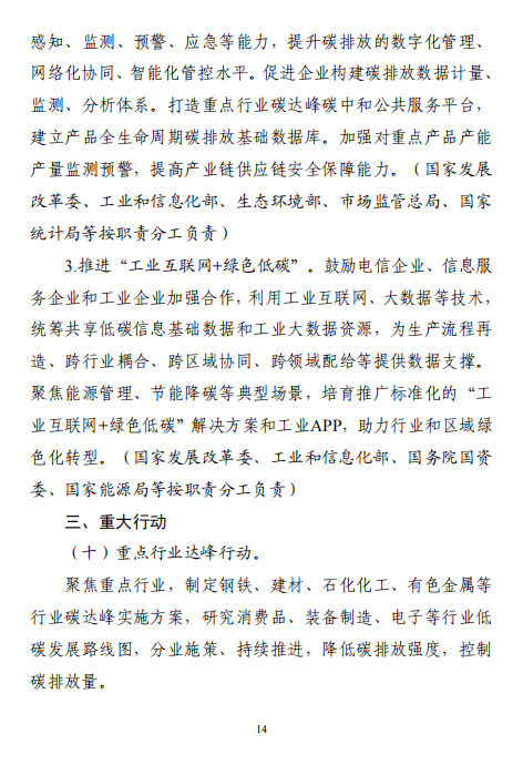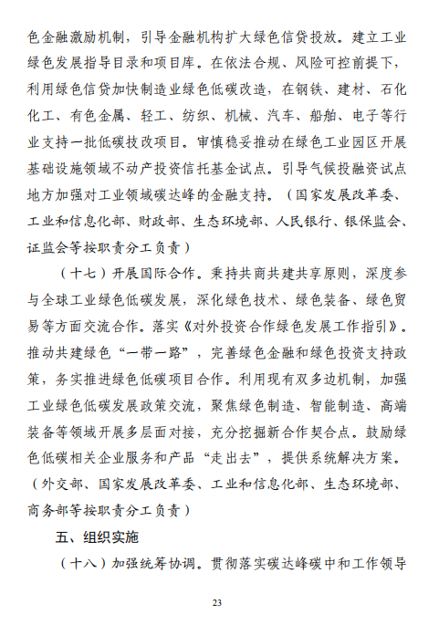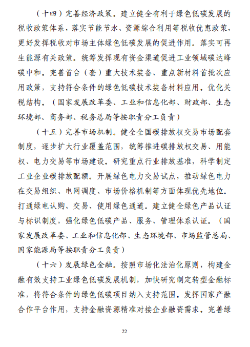 工業(yè)和信息化部 國家發(fā)展改革委 生態(tài)環(huán)境部關(guān)于印發(fā)工業(yè)領(lǐng)域碳達(dá)峰實施方案的通知工信部聯(lián)節(jié)〔2022〕88號外交部、科技部、司法部、財政部、住房城鄉(xiāng)建設(shè)部、交通運輸部、商務(wù)部、人民銀行、國資委、稅務(wù)總局、市場監(jiān)管總局、統(tǒng)計局、銀保監(jiān)會、證監(jiān)會、能源局、林草局、郵政局,各省、自治區(qū)、直轄市及計劃單列市、新疆生產(chǎn)建設(shè)兵團(tuán)工業(yè)和信息化主管部門、發(fā)展改革委、生態(tài)環(huán)境廳(局):《工業(yè)領(lǐng)域碳達(dá)峰實施方案》已經(jīng)碳達(dá)峰碳中和工作領(lǐng)導(dǎo)小組審議通過,現(xiàn)印發(fā)給你們,請認(rèn)真貫徹落實。