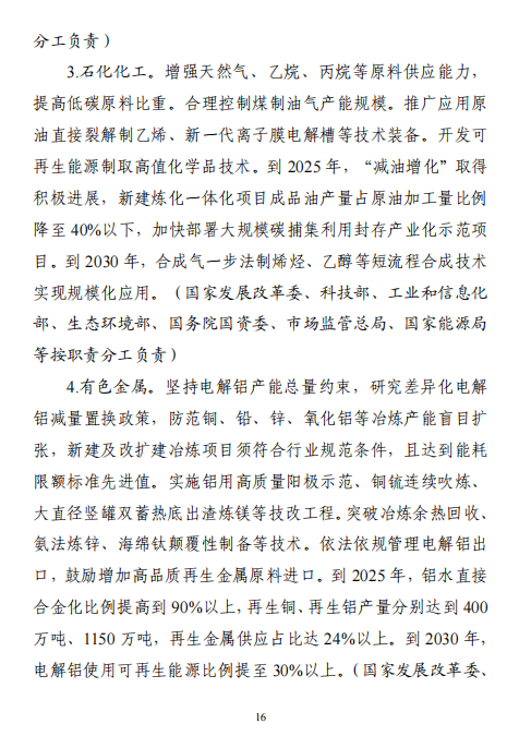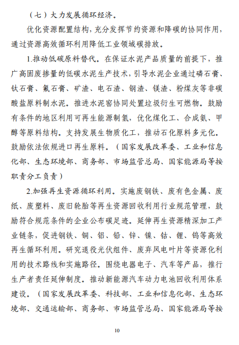 “十五五”期間,產(chǎn)業(yè)結(jié)構(gòu)布局進(jìn)一步優(yōu)化,工業(yè)能耗強度、二氧化碳排放強度持續(xù)下降,努力達(dá)峰削峰,在實現(xiàn)工業(yè)領(lǐng)域碳達(dá)峰的基礎(chǔ)上強化碳中和能力,基本建立以高效、綠色、循環(huán)、低碳為重要特征的現(xiàn)代工業(yè)體系。確保工業(yè)領(lǐng)域二氧化碳排放在2030年前達(dá)峰。方案指出,加強再生資源循環(huán)利用。實施廢鋼鐵、廢有色金屬、廢紙、廢塑料、廢舊輪胎等再生資源回收利用行業(yè)規(guī)范管理,鼓勵符合規(guī)范條件的企業(yè)公布碳足跡。延伸再生資源精深加工產(chǎn)業(yè)鏈條,促進(jìn)鋼鐵、銅、鋁、鉛、鋅、鎳、鈷、鋰、鎢等高效再生循環(huán)利用。研究退役光伏組件、廢棄風(fēng)電葉片等資源化利用的技術(shù)路線和實施路徑。圍繞電器電子、汽車等產(chǎn)品,推行生產(chǎn)者責(zé)任延伸制度。推動新能源汽車動力電池回收利用體系建設(shè)。