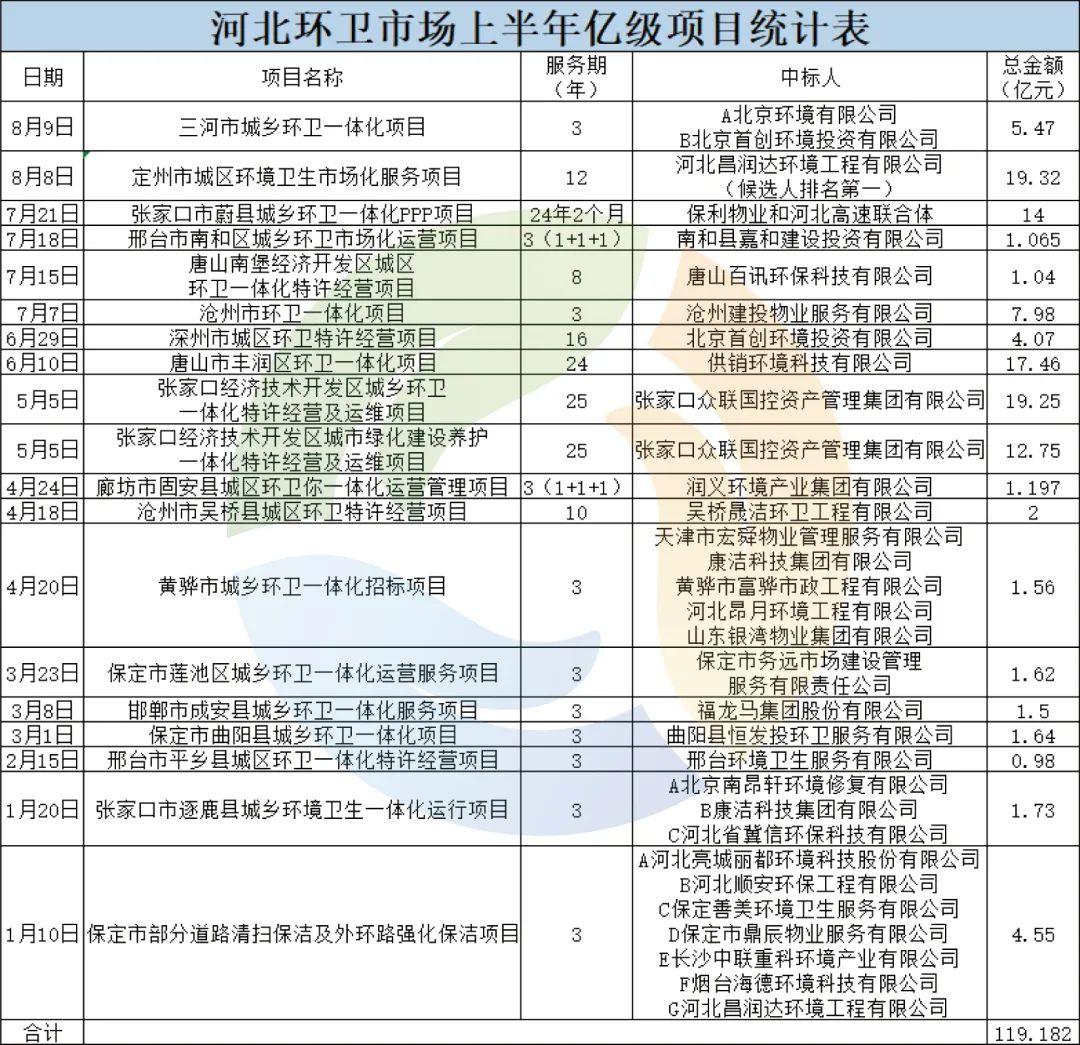 據(jù)《環(huán)保圈》不完全統(tǒng)計(jì),2022年1月至今,河北省已開標(biāo)19個(gè)億級(jí)環(huán)衛(wèi)項(xiàng)目,中標(biāo)金額合計(jì)119.18億元。(注:數(shù)據(jù)來源為中國(guó)政府采購網(wǎng)及各地政府采購網(wǎng)、招投標(biāo)公共服務(wù)平臺(tái)等)而據(jù)環(huán)衛(wèi)科技網(wǎng)歷史數(shù)據(jù),2021年全年,河北環(huán)衛(wèi)市場(chǎng)僅開標(biāo)6個(gè)億級(jí)項(xiàng)目,總金額約為14億元。如今,2022年才過7個(gè)多月,中標(biāo)金額就增長(zhǎng)了7.5倍??梢?,河北省今年環(huán)衛(wèi)項(xiàng)目釋放量和項(xiàng)目體量較往年都有飛躍式的增長(zhǎng)。而從河北各個(gè)地區(qū)來看,當(dāng)屬張家口市項(xiàng)目釋放量最多,共計(jì)開標(biāo)4個(gè)項(xiàng)目,中標(biāo)金額合計(jì)47.73億元,約占19個(gè)項(xiàng)目總金額的40%。從中標(biāo)企業(yè)上看,共計(jì)29家企業(yè)榜上有名。其中,外地企業(yè)12家,占比約41%。外地企業(yè)對(duì)河北環(huán)衛(wèi)市場(chǎng)的“侵蝕”程度可見一斑。此外,中標(biāo)金額排名前5的項(xiàng)目中,排名3、4的唐山市豐潤(rùn)區(qū)項(xiàng)目和張家口市蔚縣項(xiàng)目,中標(biāo)人分別為供銷環(huán)境科技有限公司和保利物業(yè)(牽頭人),均為外地企業(yè)。這兩個(gè)項(xiàng)目的中標(biāo)金額之和為此5個(gè)大項(xiàng)目總金額的38%。可見,在上半年的環(huán)衛(wèi)大標(biāo)爭(zhēng)奪上,外地企業(yè)還是能搶占一席之地的。另一個(gè)值得關(guān)注的是,在今年的河北環(huán)衛(wèi)市場(chǎng)上,國(guó)資控股企業(yè)頗有幾分大放異彩的意味,人數(shù)雖少,卻屢屢奪得大標(biāo)。29家企業(yè)中,有8個(gè)中標(biāo)人為國(guó)資控股企業(yè),此8家企業(yè)中標(biāo)金額合計(jì)65.98億元,占總金額的55%。如32億元的張家口經(jīng)濟(jì)技術(shù)開發(fā)區(qū)2個(gè)項(xiàng)目中標(biāo)人為張家口眾聯(lián)國(guó)控資產(chǎn)管理集團(tuán)有限公司;超17億元的唐山市豐潤(rùn)區(qū)環(huán)衛(wèi)一體化項(xiàng)目中標(biāo)人為供銷環(huán)境科技有限公司;近8億元的滄州市環(huán)衛(wèi)一體化項(xiàng)目中標(biāo)人為滄州建投物業(yè)服務(wù)有限公司等,中標(biāo)人均為國(guó)資控股。除了已經(jīng)中標(biāo)的項(xiàng)目,目前河北省在招標(biāo)的億級(jí)環(huán)衛(wèi)項(xiàng)目還有5個(gè),預(yù)算金額合計(jì)超11億元,加上已中標(biāo)項(xiàng)目,整個(gè)河北省環(huán)衛(wèi)項(xiàng)目釋放量已超130億元。末端處置市場(chǎng)欣欣向榮,建筑垃圾市場(chǎng)崛起