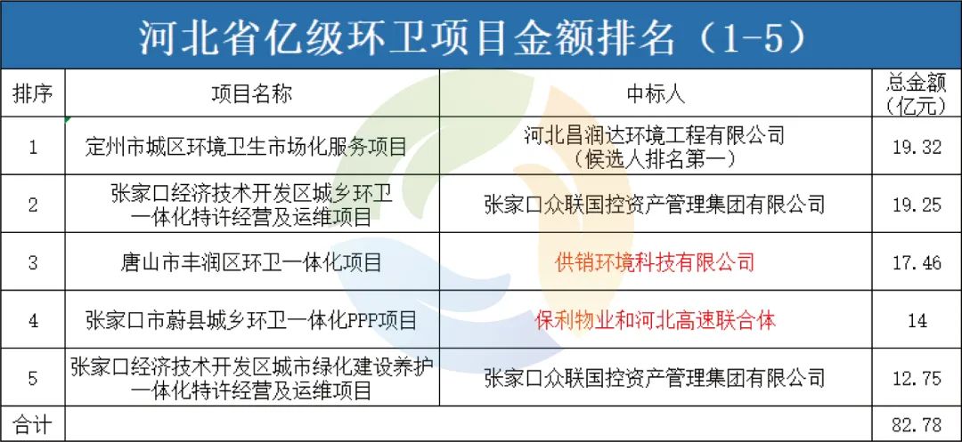 8月8日,超19億元的定州市城區(qū)環(huán)境衛(wèi)生市場(chǎng)化服務(wù)項(xiàng)目公布中標(biāo)候選人公示,河北昌潤(rùn)達(dá)環(huán)境工程有限公司排名第一;8月9日,約5.5億元三河市城鄉(xiāng)環(huán)衛(wèi)一體化項(xiàng)目又被北京環(huán)境有限公司和北京首創(chuàng)環(huán)境投資有限公司攜手?jǐn)孬@。至此,河北省今年已開標(biāo)的億級(jí)環(huán)衛(wèi)項(xiàng)目總金額已超119億元,加上在招標(biāo)項(xiàng)目,河北省今年環(huán)衛(wèi)項(xiàng)目的釋放量已超130億元!不僅如此,進(jìn)入2022年之后,河北省在生活垃圾末端處置方面的發(fā)展也較為迅速,主要體現(xiàn)在生活垃圾焚燒項(xiàng)目、建筑垃圾資源化利用項(xiàng)目等方面。而這一切的“大爆發(fā)”,和地方“十四五”時(shí)期各項(xiàng)規(guī)劃及相關(guān)政策有密切聯(lián)系??梢源竽懙仡A(yù)測(cè),未來5年,河北將是環(huán)衛(wèi)企業(yè)競(jìng)相爭(zhēng)奪的“圣地”。項(xiàng)目釋放量突破130億,國(guó)資控股企業(yè)大放異彩