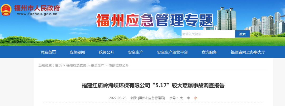 2022年5月17日上午8時54分,福建紅廟嶺海峽環(huán)保有限公司10萬方調(diào)節(jié)池上方外包作業(yè)人員違規(guī)用氬弧焊對除臭設(shè)施風(fēng)管漏點進行焊接施工時發(fā)生燃爆,造成3人死亡,3人受傷,5#、6#池頂蓋坍塌,池頂除臭裝置損壞,直接經(jīng)濟損失約1800萬元。事故發(fā)生后,尹力書記、趙龍省長、郭寧寧常務(wù)副省長、林文斌副省長等領(lǐng)導(dǎo)第一時間做出重要批示,要求全力搜救失聯(lián)人員,全力搶救受傷人員;嚴格救援現(xiàn)場管控,防止發(fā)生次生災(zāi)害;查明原因,舉一反三,排查隱患,防范類似事故發(fā)生;做好善后工作。省委常委、市委林寶金書記、省應(yīng)急廳伍斌廳長、吳賢德市長、省建設(shè)廳王明炫副廳長等領(lǐng)導(dǎo)到場指導(dǎo)應(yīng)急救援。省消防救援總隊高寧宇總隊長、蘇作琴副總隊長率領(lǐng)總隊全勤指揮部到場指揮救援行動。林中麟常務(wù)副市長全時指揮市應(yīng)急局、市消防救援支隊、市城管委、市衛(wèi)健委、市公安局、晉安區(qū)委區(qū)政府及多支民間救援隊進行現(xiàn)場救援。根據(jù)《生產(chǎn)安全事故報告和調(diào)查處理條例》(國務(wù)院令第493號),經(jīng)市政府授權(quán),市應(yīng)急管理局牽頭市城管委、市公安局、市總工會、晉安區(qū)政府成立市政府福建紅廟嶺海峽環(huán)保有限公司“5.17”燃爆較大事故調(diào)查組(以下簡稱事故調(diào)查組),聘請3名專家參與調(diào)查,并邀請市紀委監(jiān)委派員參加。事故調(diào)查組按照“四不放過”和“科學(xué)嚴謹、依法依規(guī)、實事求是、注重實效”的原則,通過現(xiàn)場勘查、技術(shù)鑒定、調(diào)查取證、專家論證、人員問詢、調(diào)閱資料、問題核實和綜合分析,查明了事故發(fā)生的經(jīng)過、原因、應(yīng)急救援、人員傷亡情況和直接經(jīng)濟損失,認定了事故性質(zhì)和責(zé)任,提出了對相關(guān)責(zé)任人員及責(zé)任單位的處理建議及防范整改措施建議。(一)福建紅廟嶺海峽環(huán)保有限公司。成立于2014年02月21日,注冊資本為500萬人民幣,法定代表人為徐國丹,經(jīng)營狀態(tài)為存續(xù),工商注冊號為350100100368616,注冊地址為福州市晉安區(qū)鼓山鎮(zhèn)洋里路16號綜合樓一樓107室,經(jīng)營范圍包括城市污水處理及其再生利用;垃圾滲瀝液收集及處理、環(huán)境污染治理設(shè)施的投資、建設(shè)、運營;城市餐廚垃圾處理;環(huán)境污染治理設(shè)施運營咨詢服務(wù)及技術(shù)服務(wù)(依法須經(jīng)批準的項目,經(jīng)相關(guān)部門批準后方可開展經(jīng)營活動)。為福建海峽環(huán)保集團股份有限公司獨立法人的全資子公司,10萬方新調(diào)節(jié)池項目的實際管理單位。(二)福建致辰宇洋環(huán)保科技有限公司。成立于2015年3月12日,注冊資本為1000萬人民幣,法定代表人為俞果,經(jīng)營狀態(tài)為存續(xù),工商注冊號為350100100432860,注冊地址為福州市晉安區(qū)新店鎮(zhèn)秀山路245號索高廣場4#樓1層101單元,經(jīng)營范圍包括一般項目:大氣污染治理;水污染治理;生態(tài)環(huán)境監(jiān)測及檢測儀器儀表銷售;大氣污染監(jiān)測及檢測儀器儀表銷售;海洋水質(zhì)與生態(tài)環(huán)境監(jiān)測儀器設(shè)備銷售;環(huán)境保護監(jiān)測;水質(zhì)污染物監(jiān)測及檢測儀器儀表銷售等(除依法須經(jīng)批準的項目外,憑營業(yè)執(zhí)照依法自主開展經(jīng)營活動)。受福建紅廟嶺海峽環(huán)保有限公司委托對10萬方新調(diào)節(jié)池進行除臭設(shè)施提升。(三)福建省偉邦市政環(huán)保工程設(shè)計研究院有限公司,成立于2006-04-26,注冊資本為300萬人民幣,法定代表人為劉建偉,經(jīng)營狀態(tài)為開業(yè),工商注冊號為350100100173044,注冊地址為福州市鼓樓區(qū)工業(yè)路611號福建高新技術(shù)創(chuàng)業(yè)園主樓4層北6房,經(jīng)營范圍包括市政、環(huán)保工程技術(shù)咨詢、設(shè)計,市政、環(huán)保設(shè)備儀器儀表研發(fā)、推廣、銷售,環(huán)保生物廢水處理劑的研發(fā)、推廣、銷售,市政環(huán)保工程承包建設(shè)。(依法須經(jīng)批準的項目,經(jīng)相關(guān)部門批準后方可開展經(jīng)營活動)。該公司投資入股福建致辰宇洋環(huán)??萍加邢薰境袛埖?0萬方新調(diào)節(jié)池的除臭設(shè)施提升項目;受福建致辰宇洋環(huán)保科技有限公司的法人代表俞果委托,該公司工程師陳連文負責(zé)10萬方新調(diào)節(jié)池的除臭設(shè)施提升項目具體管理。(四)福州嘉鑫華強金屬制品有限公司。成立于2018-06-15,注冊資本為200萬人民幣,法定代表人為羅維嘉,經(jīng)營狀態(tài)為存續(xù),工商注冊號為350121100236032,注冊地址為福建省福州市閩侯縣祥謙鎮(zhèn)林森大道28號,經(jīng)營范圍包括金屬制品、工藝品、建筑材料、家具的加工;家具、文體用品、日用百貨、五金交電的銷售及通過互聯(lián)網(wǎng)銷售。(依法須經(jīng)批準的項目,經(jīng)相關(guān)部門批準后方可開展經(jīng)營活動)。陳連文聯(lián)系該單位為10萬方新調(diào)節(jié)池除臭設(shè)施提升項目制作配套風(fēng)管。(五)福州市紅廟嶺垃圾綜合處理中心,該單位為福州市城市管理委員會直屬事業(yè)單位,主要職責(zé)為承擔(dān)對生活垃圾進行無害化處理和綜