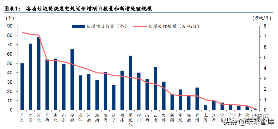 2017 年 12 月 12 日,國家發(fā)改委聯(lián)合五部委下發(fā)《關(guān)于進(jìn)一步做好生活垃圾焚燒發(fā)電廠規(guī) 劃選址工作的通知》,要求各省(區(qū)、市)應(yīng)編制本地區(qū)省級(jí)生活垃圾焚燒發(fā)電中長期專項(xiàng) 規(guī)劃。截至 2022 年 5 月底,全國已有 21 個(gè)省(區(qū)、市)發(fā)布中長期專項(xiàng)規(guī)劃及修訂稿, 13 個(gè)?。▍^(qū)、市)相繼發(fā)布涉及生活垃圾焚燒發(fā)電的“十四五”規(guī)劃,整理后得到 29 個(gè) 省(區(qū)、市)規(guī)劃新增項(xiàng)目數(shù)量合計(jì) 974 個(gè),新增處理規(guī)模合計(jì) 84.3 萬噸/日。其中,規(guī)劃 新增項(xiàng)目數(shù)量前三的?。▍^(qū)、市)為河北、江蘇和安徽,分別為 78/71/65 個(gè),規(guī)劃新增處 理規(guī)模前三的省(區(qū)、市)為廣東、江蘇和河北,分別為 7.4/7.2/7.1 萬噸/日。