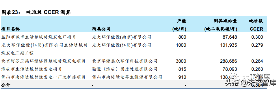 CCER 項(xiàng)目在傳統(tǒng)項(xiàng)目盈利模式基礎(chǔ)上帶來附加收入,增厚利潤空間。垃圾焚燒發(fā)電項(xiàng)目 主要在以下兩個(gè)方面實(shí)現(xiàn)了碳減排:(1)焚燒替代填埋,減少了因填埋產(chǎn)生的甲烷。(2) 焚燒發(fā)電替代火力發(fā)電,生產(chǎn)相同電量下的碳排放量相對(duì)更少。選取中國自愿減排交易信 息平臺(tái)上披露減排量的垃圾焚燒項(xiàng)目,可以計(jì)算出每噸垃圾產(chǎn)出的 CCER 約為 0.3 噸,同 時(shí)根據(jù)復(fù)旦大學(xué)可持續(xù)發(fā)展研究中心的數(shù)據(jù),目前 CCER 的買入價(jià)格預(yù)期約為 60 元/噸, 對(duì)應(yīng)每噸垃圾可帶來的增量收入約為 18 元。噸垃圾處置費(fèi)取 2021 年行業(yè)平均值 87.9 元/ 噸,噸垃圾上網(wǎng)電量取 2021 年上市公司平均數(shù)據(jù)進(jìn)行測(cè)算,CCER 在收入/利潤端可為項(xiàng) 目帶來約 6.4%/28.7%的增厚空間。在國補(bǔ)減少 30%情況下,CCER 在收入/利潤端仍可帶 來 1.9%/8.6%的增厚空間。