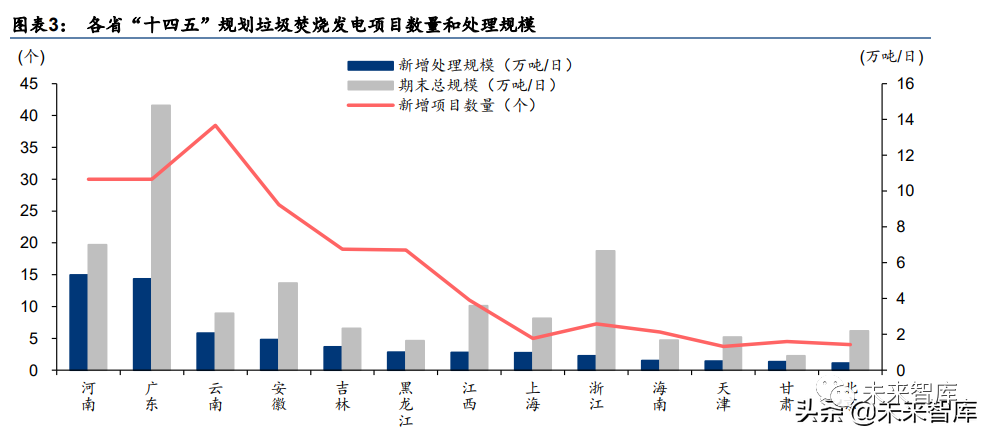 “十四五”規(guī)劃提出,到 2025 年底,全國城鎮(zhèn)生活垃圾焚燒處理能力達(dá)到 80 萬噸/日左右, 相對(duì)“十三五”末期增量空間為 22 萬噸/日;城市生活垃圾焚燒處理能力占比 65%左右,相對(duì) “十三五”末期提升空間仍有 20 個(gè)百分點(diǎn)。此外 13 個(gè)省(區(qū)、市)相繼發(fā)布涉及生活垃圾焚 燒發(fā)電的“十四五”規(guī)劃,結(jié)合國家統(tǒng)計(jì)局公布的 2020 年生活垃圾焚燒發(fā)電產(chǎn)能數(shù)據(jù),我 們測(cè)算得到“十四五”期間 13 個(gè)省(區(qū)、市)規(guī)劃新增垃圾焚燒項(xiàng)目 204 個(gè),新增產(chǎn)能 21.2 萬噸/日,其中,規(guī)劃新增處理規(guī)模前二的?。▍^(qū)、市)為河南和廣東,分別為 5.3/5.1 萬噸/日,對(duì)應(yīng)規(guī)劃新增項(xiàng)目數(shù)量均為 30 個(gè)。