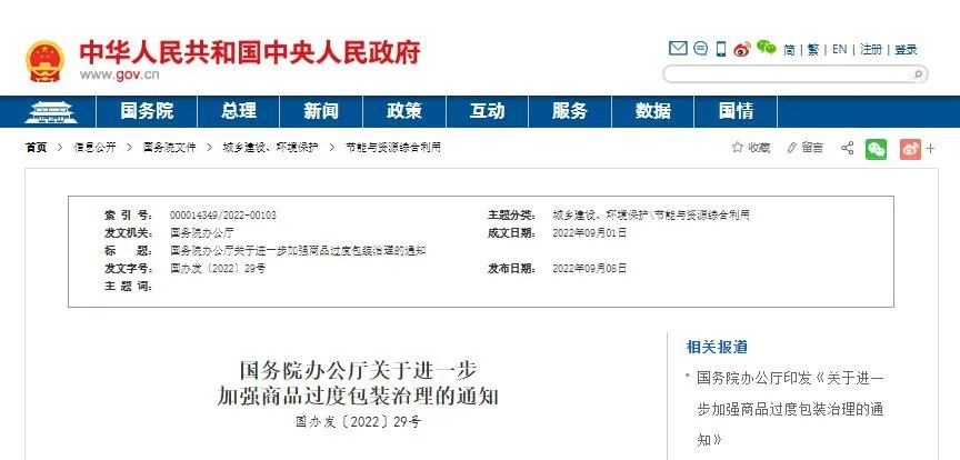 國務(wù)院辦公廳關(guān)于進(jìn)一步加強(qiáng)商品過度包裝治理的通知各省、自治區(qū)、直轄市人民政府,國務(wù)院各部委、各直屬機(jī)構(gòu):商品過度包裝是指超出了商品保護(hù)、展示、儲存、運(yùn)輸?shù)日9δ芤蟮陌b,主要表現(xiàn)為包裝層數(shù)過多、包裝空隙過大、包裝成本過高、選材用料不當(dāng)?shù)?。近年來,各地區(qū)、各部門按照《國務(wù)院辦公廳關(guān)于治理商品過度包裝工作的通知》(國辦發(fā)〔2009〕5號)部署,認(rèn)真推進(jìn)商品過度包裝治理,完善相關(guān)法律法規(guī)標(biāo)準(zhǔn),取得積極進(jìn)展。但治理工作仍存在不少薄弱環(huán)節(jié)和突出問題,尤其是隨著消費(fèi)新業(yè)態(tài)快速發(fā)展,商品過度包裝現(xiàn)象有“卷土重來”之勢。為貫徹落實(shí)黨中央、國務(wù)院決策部署,進(jìn)一步加強(qiáng)商品過度包裝治理,經(jīng)國務(wù)院同意,現(xiàn)就有關(guān)事項(xiàng)通知如下。各地區(qū)、各部門要以習(xí)近平新時代中國特色社會主義思想為指導(dǎo),深入貫徹習(xí)近平生態(tài)文明思想,立足新發(fā)展階段,完整、準(zhǔn)確、全面貫徹新發(fā)展理念,構(gòu)建新發(fā)展格局,推動高質(zhì)量發(fā)展,認(rèn)真貫徹落實(shí)固體廢物污染環(huán)境防治法、消費(fèi)者權(quán)益保護(hù)法、標(biāo)準(zhǔn)化法、價格法等法律法規(guī)和國家有關(guān)標(biāo)準(zhǔn),充分認(rèn)識進(jìn)一步加強(qiáng)商品過度包裝治理的重要性和緊迫性,在生產(chǎn)、銷售、交付、回收等各環(huán)節(jié)明確工作要求,強(qiáng)化監(jiān)管執(zhí)法,健全標(biāo)準(zhǔn)體系,完善保障措施,堅(jiān)決遏制商品過度包裝現(xiàn)象,為促進(jìn)生產(chǎn)生活方式綠色轉(zhuǎn)型、加強(qiáng)生態(tài)文明建設(shè)提供有力支撐。到2025年,基本形成商品過度包裝全鏈條治理體系,相關(guān)法律法規(guī)更加健全,標(biāo)準(zhǔn)體系更加完善,行業(yè)管理水平明顯提升,線上線下一體化執(zhí)法監(jiān)督機(jī)制有效運(yùn)行,商品過度包裝治理能力顯著增強(qiáng)。月餅、粽子、茶葉等重點(diǎn)商品過度包裝違法行為得到有效遏制,人民群眾獲得感和滿意度顯著提升。(一)加強(qiáng)包裝領(lǐng)域技術(shù)創(chuàng)新。推動包裝企業(yè)提供設(shè)計(jì)合理、用材節(jié)約、回收便利、經(jīng)濟(jì)適用的包裝整體解決方案,自主研發(fā)低克重、高強(qiáng)度、功能化包裝材料及其生產(chǎn)設(shè)備,創(chuàng)新研發(fā)商品和快遞一體化包裝產(chǎn)品。充分發(fā)揮包裝企業(yè)在推廣簡約包裝、倡導(dǎo)理性消費(fèi)中的橋梁紐帶作用,推動包裝設(shè)計(jì)、商品生產(chǎn)等上下游各環(huán)節(jié)踐行簡約適度理念。(工業(yè)和信息化部和各地方人民政府按職責(zé)分工負(fù)責(zé))(二)防范商品生產(chǎn)環(huán)節(jié)過度包裝。督促指導(dǎo)商品生產(chǎn)者嚴(yán)格按照限制商品過度包裝強(qiáng)制性標(biāo)準(zhǔn)生產(chǎn)商品,細(xì)化限制商品過度包裝的管理要求,建立完整的商品包裝信息檔案,記錄商品包裝的設(shè)計(jì)、制造、使用等信息。引導(dǎo)商品生產(chǎn)者使用簡約包裝,優(yōu)化商品包裝設(shè)計(jì),減少商品包裝層數(shù)、材料、成本,減少包裝體積、重量,減少油墨印刷,采用單一材料或便于分離的材料。(工業(yè)和信息化部、市場監(jiān)管總局等部門和各地方人民政府按職責(zé)分工負(fù)責(zé))督促商品生產(chǎn)者嚴(yán)格遵守標(biāo)準(zhǔn)化法要求,公開其執(zhí)行的包裝有關(guān)強(qiáng)制性標(biāo)準(zhǔn)、推薦性標(biāo)準(zhǔn)、團(tuán)體標(biāo)準(zhǔn)或企業(yè)標(biāo)準(zhǔn)的編號和名稱。(市場監(jiān)管總局和各地方人民政府按職責(zé)分工負(fù)責(zé))引導(dǎo)醫(yī)療機(jī)構(gòu)針對門診、住院、慢性病等不同場景和類型提出藥品包裝規(guī)格需求。引導(dǎo)藥品生產(chǎn)者優(yōu)化藥品包裝規(guī)格。(國家衛(wèi)生健康委、國家藥監(jiān)局和各地方人民政府按職責(zé)分工負(fù)責(zé))(三)避免銷售過度包裝商品。督促指導(dǎo)商品銷售者細(xì)化采購、銷售環(huán)節(jié)限制商品過度包裝有關(guān)要求,明確不銷售違反限制商品過度包裝強(qiáng)制性標(biāo)準(zhǔn)的商品。加強(qiáng)對電商企業(yè)的督促指導(dǎo),實(shí)現(xiàn)線上線下要求一致。鼓勵商品銷售者向供應(yīng)方提出有關(guān)商品綠色包裝和簡約包裝要求。(商務(wù)部、市場監(jiān)管總局和各地方人民政府按職責(zé)分工負(fù)責(zé))督促指導(dǎo)外賣平臺企業(yè)完善平臺規(guī)則,對平臺內(nèi)經(jīng)營者提出外賣包裝減量化要求。(商務(wù)部負(fù)責(zé))督促指導(dǎo)餐飲經(jīng)營者對外賣包裝依法明碼標(biāo)價。(市場監(jiān)管總局和各地方人民政府按職責(zé)分工負(fù)責(zé))(四)推進(jìn)商品交付環(huán)節(jié)包裝減量化。指導(dǎo)寄遞企業(yè)制修訂包裝操作規(guī)范,細(xì)化限制快遞過度包裝要求,并通過規(guī)范作業(yè)減少前端收寄環(huán)節(jié)的過度包裝。鼓勵寄遞企業(yè)使用低克重、高強(qiáng)度的紙箱、免膠紙箱,通過優(yōu)化包裝結(jié)構(gòu)減少填充物使用量。(國家郵政局和各地方人