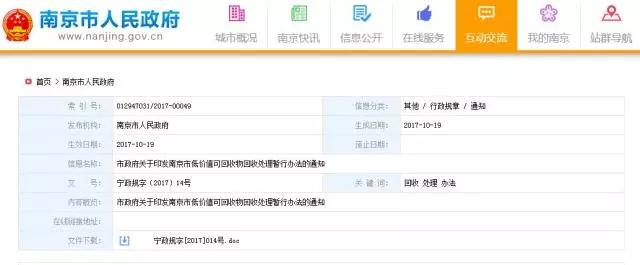 10月19日,南京市政府公布了《南京市低價值可回收物回收處理暫行辦法》,根據(jù)辦法規(guī)定,城市管理部門負(fù)責(zé)管理轄區(qū)內(nèi)低價值可回收物回收工作,并通過政府采購方式向企業(yè)購買低價值可回收物的回收、處理服務(wù)。辦法自今年11月20日起施行,有效期3年。