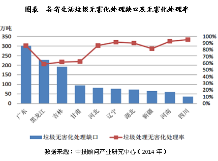 但個別地區(qū)生活垃圾無害化處理仍有缺口,主要是一些垃圾產(chǎn)生量基數(shù)較大的省份,如廣東省雖然無害化處理率已經(jīng)達到86%,但缺口仍有300萬噸,以及垃圾處理發(fā)展較為緩慢的地區(qū),如黑龍江、吉林和甘肅三省無害化處理率都在60%左右,尚有較大的增長空間。因此雖然垃圾的無害化處理在全國整體已接近飽和,但部分地區(qū)仍有快速擴張的機會。