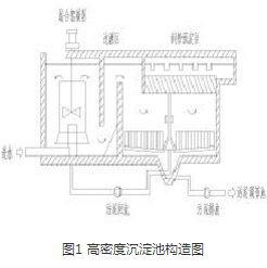 高密度沉淀池由混合區(qū)、絮凝區(qū)、斜管沉淀區(qū)、污泥濃縮區(qū)、中間集水渠及污泥回流系統(tǒng)和剩余污泥排放系統(tǒng)組成?;緲?gòu)造見圖1。