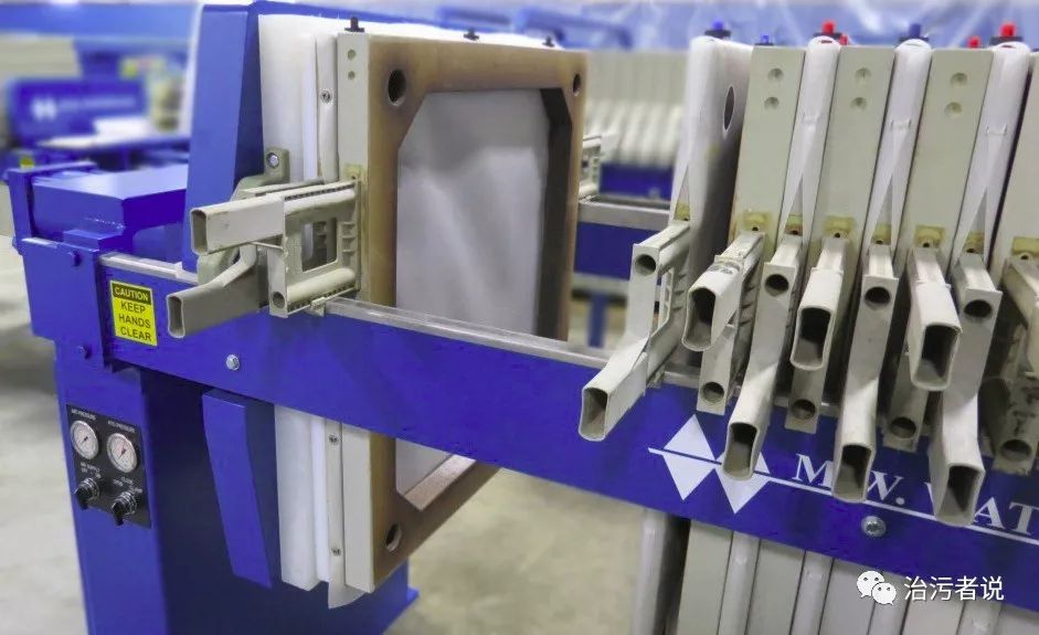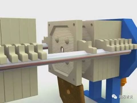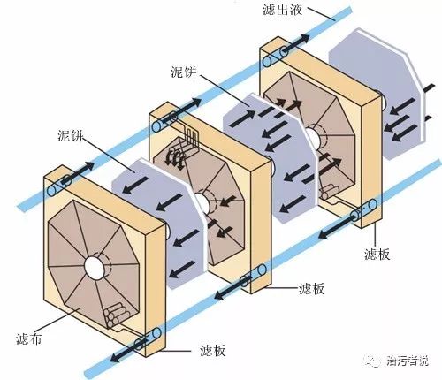 上圖可以看到濾布,濾板,泥餅,濾出液之間的關(guān)系??梢钥吹桨蹇蚴綁簽V機更像一臺不會轉(zhuǎn)動的濾帶壓濾機,通過固定在濾板上的濾布一次次擠壓,完成了污泥脫水的過程。