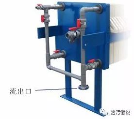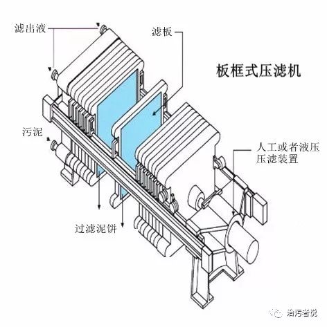 從壓濾機的示意圖可以看到,板框式壓濾機是由一張張濾板疊加而成的,濾板之間是有空間的,污泥注入這個濾板之間后,通過人工或者液壓的壓濾裝置,把污泥中的水分擠壓出去,形成泥餅,擠壓出來的過濾液通過濾板上設(shè)置的濾出液管流出板框壓濾機外。