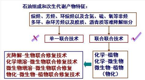 石油是烷烴、芳烴、環(huán)烷烴及含氮、硫、氧等非烴類組分的混合物,其中多環(huán)、雜環(huán)芳烴以及膠質(zhì)、瀝青質(zhì)等組分生物降解性較差。石油及次生代謝產(chǎn)的組成特征決定了修復(fù)的難度和復(fù)雜性。因此, 單一聯(lián)合技術(shù)不能很好的解決污染問題時,需要考慮聯(lián)合使用各種處理技術(shù)。