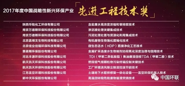 2017年下半年,中國環(huán)聯(lián)面向全國征集 “戰(zhàn)略性新興環(huán)保產(chǎn)業(yè)先進(jìn)工程技術(shù)”,以企業(yè)上報資料為依據(jù),經(jīng)群眾投票與專家評審,共有10項工程技術(shù)獲得“中國戰(zhàn)略性新興環(huán)保產(chǎn)業(yè)先進(jìn)工程技術(shù)獎”。