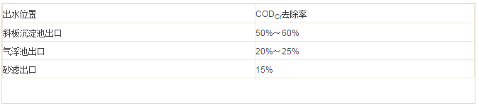 反應(yīng)槽采用推流式反應(yīng)槽,分為三格。第一格加堿將pH調(diào)高至10~10.5,加入CaCl2,第二格加FeSO4,第三格加混凝劑PAM,反應(yīng)后進(jìn)入斜板沉淀池進(jìn)行固液分離。三格停留時(shí)間分別為15min、15min、7.5min。斜板沉淀池表面負(fù)荷按2m3/m2˙h設(shè)計(jì)。一級(jí)反應(yīng)CODCr去除率為50%~60%。