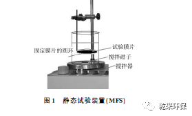 膜片處理:將大片(張)膜用除鹽水潤(rùn)濕透水側(cè),輕輕地平整固定在玻璃板上,使用特制的裁剪裝置(一端軟固定、一端鋒利刀片)將膜裁剪成需要的尺寸,切忌刮傷膜片或重壓膜片。將裁剪好的膜片在滅菌的除鹽水中浸泡24h,其間換水3次。靜態(tài)試驗(yàn)的膜片需要事先固定在支撐的圓環(huán)上,再進(jìn)行滅菌處理。試驗(yàn)菌液(中水中微生物菌種)培養(yǎng)和配制:取中水放于事先經(jīng)過(guò)滅菌處理的潔凈燒杯中;取2個(gè)已經(jīng)殺菌的培養(yǎng)皿,利用移液管從燒杯中分別取1mL中水置于培養(yǎng)皿中。用潔凈燒杯稱取牛肉膏0.5g,蛋白胨1g,氯化鈉0.5g,瓊脂2g,加除鹽水溶于100mL錐形瓶中,攪拌并調(diào)節(jié)pH 至7.2~7.4,塞緊瓶口,放于滅菌鍋中滅菌,4h后,取出錐形瓶冷卻至50℃左右,倒入培養(yǎng)皿,以剛好覆蓋培養(yǎng)皿底部為宜;蓋好培養(yǎng)皿,置于37℃恒溫箱中培養(yǎng)24h;24h后,取出培養(yǎng)皿,用玻璃棒挑出菌落置于裝有除鹽水的燒杯中,攪拌待用。