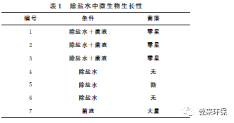 2.1反滲透產(chǎn)品水(即除鹽水)中微生物生長(zhǎng)性研究:取6個(gè)500mL的事先滅菌處理的潔凈燒杯,分別加入200mL的除鹽水;在1、2、3號(hào)燒杯中分別加入1mL配置的菌液;將6個(gè)燒杯上口蓋緊,置于室溫下靜置,5h后分別取1mL水樣培養(yǎng),觀察培養(yǎng)皿表面菌落生長(zhǎng)情況;同時(shí)另取一個(gè)培養(yǎng)皿(7號(hào)),取1mL原菌液模擬中水條件,進(jìn)行對(duì)比培養(yǎng)。試驗(yàn)結(jié)果見(jiàn)表1。