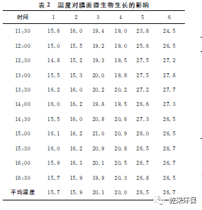 2.2水溫對(duì)微生物生長(zhǎng)的影響:分別取6個(gè)事先滅菌處理的潔凈500mL燒杯,分別加入200mL除鹽水和1mL培養(yǎng)菌液;在1、3、5號(hào)燒杯中分別放入2片干凈的反滲透膜片,在2、4、6號(hào)燒杯中分別放入2片污染的膜片;蓋好杯口;將1、2號(hào)燒杯放入冷水浴中,維持溫度在15 ℃左右,3、4號(hào)燒杯置于室溫下,5、6號(hào)燒杯熱水浴,維持溫度30℃左右;隔0.5h測(cè)各個(gè)燒杯的水溫;5h后,取出膜片,分別置于6個(gè)事先滅菌處理的干凈燒杯中,用清洗劑清洗膜;分別從每個(gè)燒杯中取出1mL清洗液,用培養(yǎng)皿培養(yǎng),觀察菌落數(shù)的多少,1~6號(hào)燒杯中取出的清洗液中,培養(yǎng)菌落數(shù)分別為1、3、3、5、7、12個(gè)。試驗(yàn)溫度見(jiàn)表2。