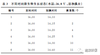2.3.1微生物污染出現(xiàn)時(shí)間試驗(yàn)分別取6個(gè)潔凈的500mL燒杯,編號(hào)后,分別加入200mL除鹽水和1mL培養(yǎng)菌液,靜置30min;同時(shí)向6個(gè)燒杯中加入2片潔凈RO膜片,開(kāi)始計(jì)時(shí),以65r/min轉(zhuǎn)速攪拌,分別在10、15、20、25、30、40min后,取出膜片,用清洗液清洗,再取其中的1mL清洗液進(jìn)行微生物培養(yǎng); 觀察6個(gè)培養(yǎng)皿中的微生物生長(zhǎng)情況。試驗(yàn)結(jié)果見(jiàn)表3。
