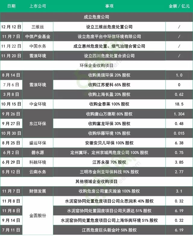 12月12日三維絲公告稱設(shè)立兩個(gè)全子公司,一個(gè)為煙氣治理的過濾技術(shù)公司,一個(gè)為固廢公司,將主要從事危廢收集、儲運(yùn)、處理處置、綜合利用業(yè)務(wù)。11月,中國水務(wù)也成立了惠州合營公司,主要從事危廢處理和煙氣治理。較早布局危廢領(lǐng)域的雪浪環(huán)境也于11月設(shè)立危廢合資公司,進(jìn)軍四川危廢市場。