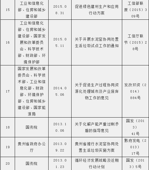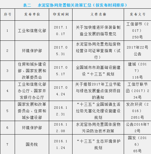 從2010年至2017年,與水泥窯協(xié)同處置相關(guān)的國務院和部委發(fā)布的政策已達26項之多(表二)。這些直接和間接支持水泥窯協(xié)同處置的政策創(chuàng)新和政府主管部門的直接推動,加快了水泥窯協(xié)同處置的創(chuàng)新發(fā)展。但遺憾的是,水泥窯協(xié)同處置企業(yè)迄今仍然不能享受國家對生活垃圾處置的財政補貼。其實,在市場機制下,他們真正需要的是公平競爭環(huán)境。筆者相信,長風破浪會有時,不用多久,水泥窯協(xié)同處置生活垃圾一定會成為政府不可或缺的好幫手。