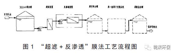 3.1流程西區(qū)輸來回用污水會流入到300 m3 的原水罐里,接下來經(jīng)過原水提升泵進(jìn)入到可以去除膠體以及細(xì)菌等的超濾裝置中,當(dāng)超濾出水的水質(zhì)滿足反滲透裝置進(jìn)水時,將還原劑和阻垢劑投入到超濾出水口經(jīng)高壓泵加壓后進(jìn)到可以去除溶解鹽類的反滲透裝置中,反滲透產(chǎn)水再進(jìn)入原有離子交換系統(tǒng)進(jìn)一步除鹽后用于鍋爐補(bǔ)給水。如圖1 為“超濾+ 反滲透”膜法工藝流程圖。