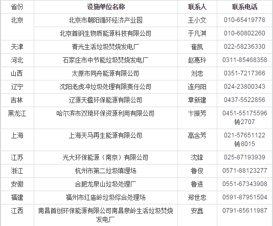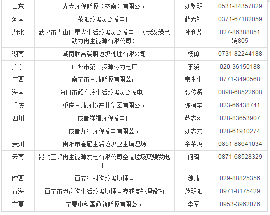 包括29個(gè)垃圾處理設(shè)施,其中垃圾焚燒設(shè)施21個(gè),垃圾填埋設(shè)施6個(gè),餐廚垃圾處理設(shè)施1個(gè),滲濾液處理設(shè)施1個(gè),分布于全國(guó)27個(gè)省、直轄市和自治區(qū),聯(lián)系人與聯(lián)系方式俱全。