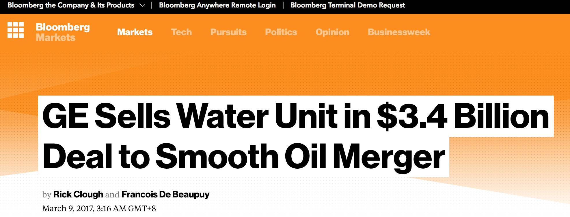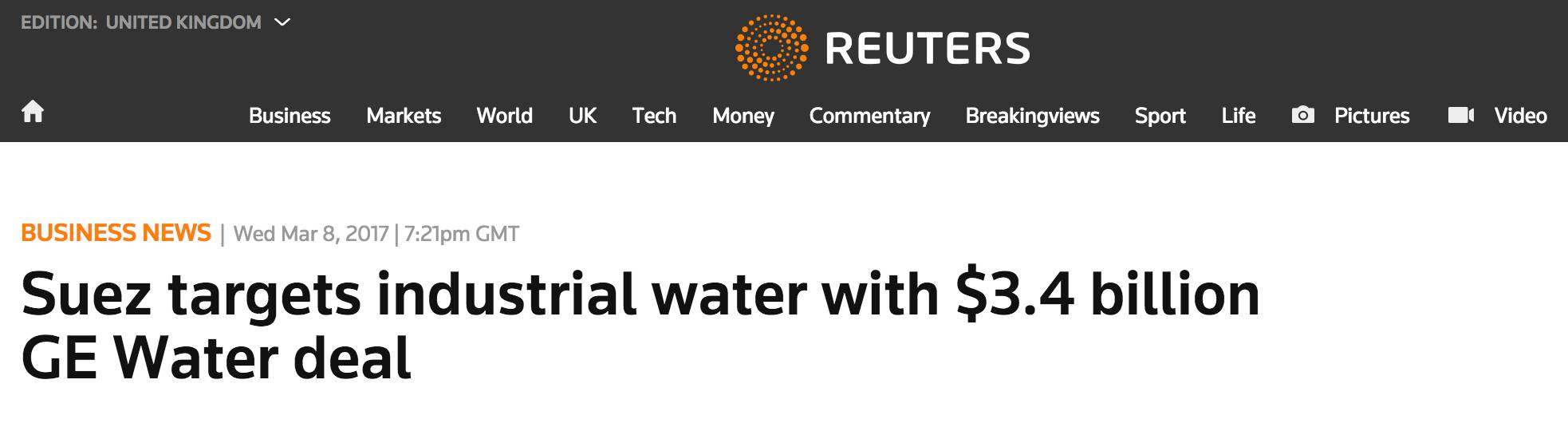 水行業(yè)巨頭法國蘇伊士環(huán)境聯(lián)合加拿大第二大養(yǎng)老金投資管理機構—魁北克儲蓄投資集團(Caisse de dép?t et placement du Québec )正式確認收購GE水處理。GE水處理是在2016年10月宣布出售的,之后曾出現(xiàn)過諸如威立雅、全球最大儀器公司丹納赫集團(Danaher Corporation)、著名的私人股權投資和投資管理公司黑石集團(Blackstone Group)等潛在買家的傳聞。 在上個月底,蘇伊士環(huán)境的新聞發(fā)言人也對外宣布正在考慮收購GE工業(yè)水處理業(yè)務的可能性。是什么讓蘇伊士在官宣之后的半個月內就完成這宗收購呢?今天我們將帶大家看看全球各大媒體對這次收購的解讀。