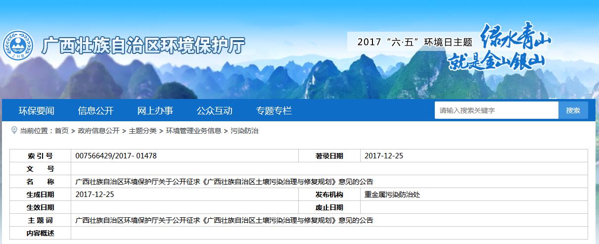 廣西壯族自治區(qū)環(huán)境保護廳關(guān)于公開征求《廣西壯族自治區(qū)土壤污染治理與修復規(guī)劃》意見的公告