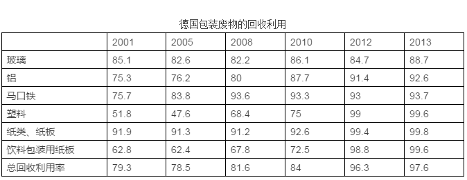 在德國,最常見的包裝材料有玻璃、鋁、馬口鐵、塑料、紙、紙板、木材,全部都能夠被用作二次原料,從而減少對(duì)原生原料的需求,可以起到降低能源消耗及污染排放的作用。根據(jù)《包裝條例》的規(guī)定,居民應(yīng)當(dāng)對(duì)包裝廢物進(jìn)行分類投放。條例獲得了廣泛的公眾支持,2013年時(shí)德國包裝廢物的回收利用率達(dá)到了97%。