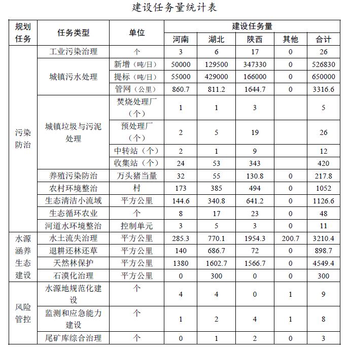 圍繞規(guī)劃目標(biāo),規(guī)劃實(shí)施污染防治、水源涵養(yǎng)與生態(tài)建設(shè)、風(fēng)險(xiǎn)管控3大類建設(shè)任務(wù),估算總投資196億元。其中:工業(yè)污染防治項(xiàng)目26項(xiàng),估算投資6.00億元;城鎮(zhèn)污水處理新增污水處理能力526830噸/日,新增管網(wǎng)3317公里,提標(biāo)改造能力650000噸/日,估算投資43.17億元;垃圾和污泥采取收集、預(yù)處理、轉(zhuǎn)運(yùn)、焚燒進(jìn)行綜合處理,新增垃圾和污泥處理處置能力8000噸/日,估算投資35.62億元;養(yǎng)殖污染防治新增217.8萬頭豬當(dāng)量治理能力,估算投資10.94億元;農(nóng)村環(huán)境綜合整治新增建制村1052個(gè),估算投資15.76億元;生態(tài)清潔小流域治理面積1126.6平方公里,估算投資11.27億元;生態(tài)循環(huán)農(nóng)業(yè)與面源污染綜合治理試點(diǎn)48個(gè),估算投資14.50億元;河道綜合整治(含人工濕地)11個(gè)控制單元,估算投資5.25億元;綜合治理水土流失面積3210平方公里,估算投資25.68億元;退耕還林還草和石漠化治理、天然林保護(hù)工程,估算投資16.4億元;水源地規(guī)范化建設(shè)項(xiàng)目9個(gè),估算投資5.93億元;監(jiān)測(cè)和應(yīng)急能力建設(shè)項(xiàng)目8個(gè),估算投資1.14億元;尾礦庫綜合治理3個(gè),估算投資4.35億元。