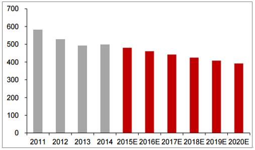 由于環(huán)保政策的更新和更加嚴格,2011年全國工業(yè)污水處理費用為1.26元/噸,根據(jù)我們預(yù)測2020年單位工業(yè)污水處理費用將達到1.94元/噸。2011年全國污水處理總量為580億噸,2011年至2014年全國工業(yè)污水總處理量成持續(xù)下降趨勢,CAGR為-3.97%。以此趨勢,我們估計2020年全國工業(yè)污水處理總量將減少至391億噸,屆時全國工業(yè)污水處理市場將達到759億元規(guī)模,由于處理成本增速大于工業(yè)污水處理總量的降幅,行業(yè)總體呈現(xiàn)逐年平穩(wěn)增加趨勢。