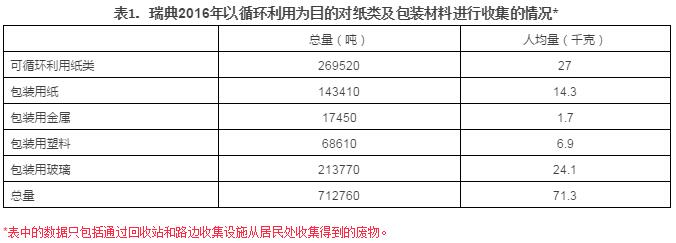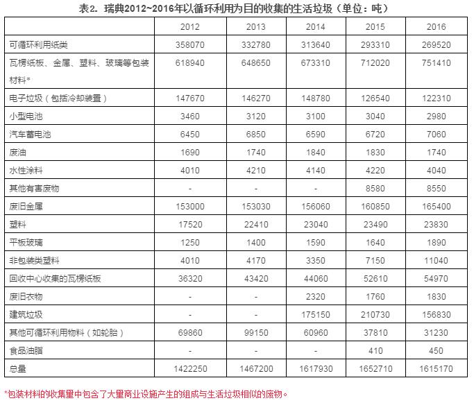 2016年時,瑞典總共循環(huán)利用了161.517萬噸的生活垃圾,相當于每人每年162千克,與2015年相比減少了2.3%,減少的主要原因為建筑垃圾的減少,包括屋面瓦、纖維玻璃、破損的陶瓷器等。上述對以循環(huán)利用為目的進行的收集量統(tǒng)計,包括居民向生產商建立的循環(huán)利用系統(tǒng)投放的包裝和可循環(huán)利用的紙制品。這一部+