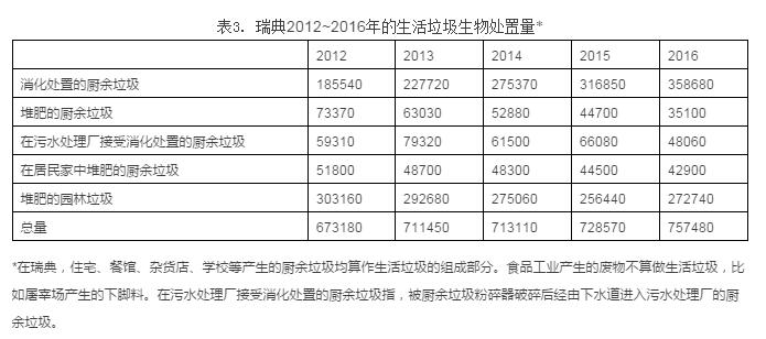2016年,瑞典共有75.748萬噸的生活垃圾進入了生物處理設施,接受厭氧消化或堆肥處理,與2015年相比增長了4%,相當于每人每年76千克。其中,如果不包括居民自己進行的堆肥,瑞典共有44.184萬噸廚余垃圾接受了生物處置。