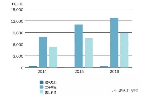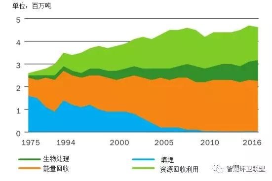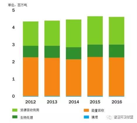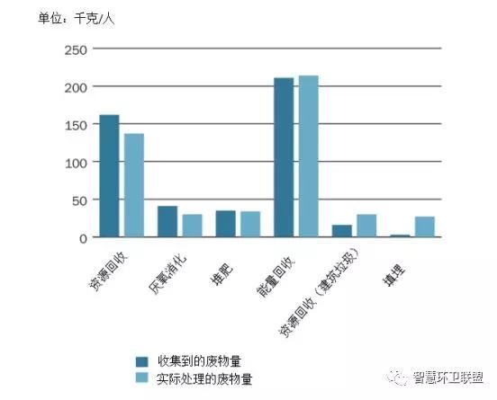 *圖表中以各種處置方法為目的進行的收集量與各種方法的實際處置量間存在一定的差別。對資源回收利用和厭氧消化來說,收集量和處置量存在差別的原因是,一部分廢物在達到處理階段后被發(fā)現(xiàn)不符合處理的要求,通常都會在焚燒廠接受能量回收處理,因此也是能量回收的處理量稍稍高于以此為目的的收集量的原因。建筑垃圾資源回收的實際處理量要高于收集量,原因是焚燒廠產生的金屬和底灰會在分類后,得到循環(huán)利用。近年來,實際接受填埋處理的廢物量要原告于以填埋為目的而進行收集的量,主要原因之一是焚燒廠能量回收會產生大量飛灰,只能接受填埋處置。