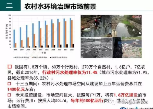 另一方面,經(jīng)過十多年的發(fā)展,與接近飽和狀態(tài)的市政污水處理領(lǐng)域相較,農(nóng)村污水處理市場仍存巨大的市場剛需,被眾多環(huán)保公司視作水處理市場的下一個(gè)風(fēng)口。業(yè)界普遍預(yù)測,“十三五”期間,全國農(nóng)村污水處理市場有望陸續(xù)得到釋放,從建設(shè)加上運(yùn)營的總投資額達(dá)到1400億元。