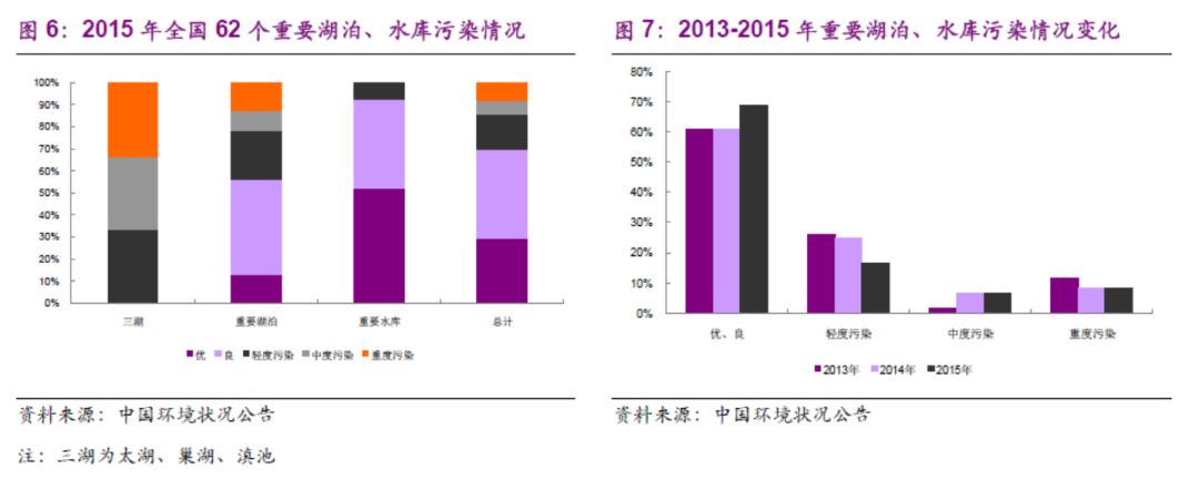 根據(jù)2015年中國(guó)環(huán)境狀況公告,“三湖”即太湖、巢湖、滇池均有不同程度的污染。重要湖泊(32個(gè)),污染比例逾30%,重點(diǎn)水庫(kù)水質(zhì)情況較好。而根據(jù)2013-2015年數(shù)據(jù)比較,污染情況改善依然不明顯。(注:優(yōu)為Ⅰ類和Ⅱ類水質(zhì),良好為Ⅲ類水質(zhì),輕度污染為Ⅳ類水質(zhì),中度污染為Ⅴ類水質(zhì),重度污染為劣Ⅴ類水質(zhì)。)