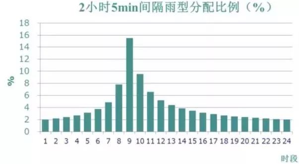 長歷時(shí)暴雨雨型主要用于整個(gè)城市排澇系統(tǒng),特別是包含排澇河道的系統(tǒng)設(shè)計(jì),對于城市區(qū)域,一般選擇6-24小時(shí)作為長歷時(shí)的雨型統(tǒng)計(jì)時(shí)段。深圳全市域可分為九大流域,分屬三個(gè)不同的水文分區(qū),南山區(qū)屬于深圳灣流域,采用珠江三角洲雨型進(jìn)行分配。