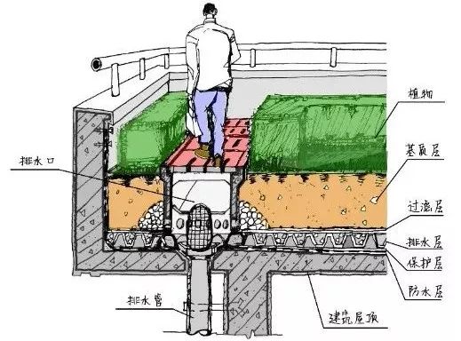 高密度開發(fā)區(qū)往往設(shè)計(jì)有裙樓及聯(lián)通塔樓之間的連廊,此處宜采用綠色屋頂形式來減少屋面徑流總量和徑流污染負(fù)荷,綠色屋頂又分為簡單式和花園式,基質(zhì)深度根據(jù)植物需求及屋頂荷載確定,簡單式綠色屋頂?shù)幕|(zhì)深度一般不大于150mm,花園式綠色屋頂在種植喬木時(shí)基質(zhì)深度可超過600mm,綠色屋頂?shù)脑O(shè)計(jì)可參考《種植屋面工程技術(shù)規(guī)程》(JGJ155)。
