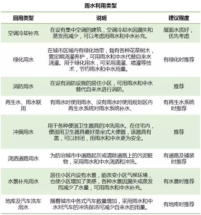 根據(jù)高密度開發(fā)地塊對雨水回用的需求,合理確定雨水回用(調(diào)蓄)池的容積,雨水回用池宜收集屋頂、綠地等較為潔凈雨水,經(jīng)過沉淀、消毒等工藝后進(jìn)行回用。也可僅作為雨水調(diào)蓄削峰用途,在進(jìn)行雨水收集及初期雨水棄流后,錯(cuò)峰排出。高密度開發(fā)地塊水量需求大且雨水處理成本低(約0.1-0.2元/m3),宜優(yōu)先考慮空調(diào)冷卻補(bǔ)充及地庫及汽車洗車用水,可參考下表選用。