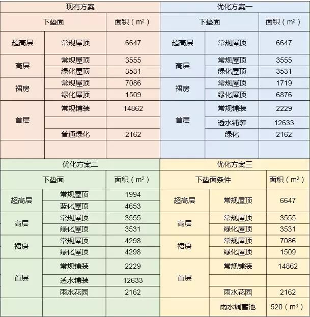 在現(xiàn)有方案基礎(chǔ)上進(jìn)行優(yōu)化設(shè)計(jì);地面鋪裝85%采用透水鋪裝;首層地面綠化全部進(jìn)行下沉式改造;裙房屋頂綠化比例提高至80%;高層屋頂綠化比例維持49%不變;超高層不做處理;