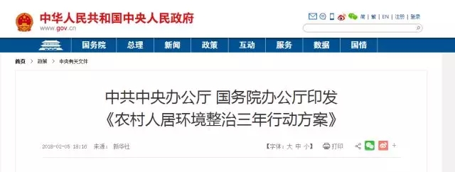 5號,中共中央辦公廳 國務院辦公廳印發(fā)《農村人居環(huán)境整治三年行動方案》?!斗桨浮访鞔_,以建設美麗宜居村莊為導向,以農村垃圾、污水治理和村容村貌提升為主攻方向,到2020年,實現(xiàn)農村人居環(huán)境明顯改善,村莊環(huán)境基本干凈整潔有序,村民環(huán)境與健康意識普遍增強。