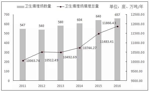 2011-2016年生活垃圾衛(wèi)生填埋場(chǎng)數(shù)量及衛(wèi)生填埋年處理量