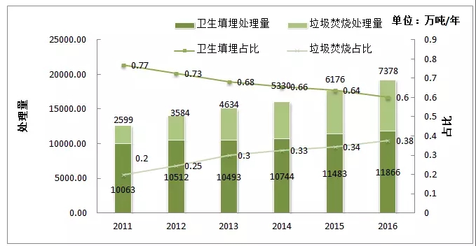 2011-2016 城市垃圾處理量及占比走勢(shì) (注:數(shù)據(jù)來(lái)自住建部國(guó)家統(tǒng)計(jì)年鑒)