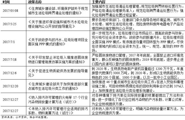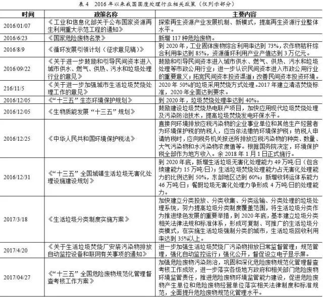 《“十三五”全國城鎮(zhèn)生活垃圾無害化處理設(shè)施建設(shè)規(guī)劃》助推垃圾焚燒發(fā)電行業(yè)快速發(fā)展;最新頒布的《國家危險廢物名錄》對于危廢的識別更加清晰,危廢處理更加有據(jù)可循;《環(huán)境保護(hù)稅法》于2018年1日1日正式施行,“排污費(fèi)改稅”有利于引導(dǎo)排污單位減少污染物排放;《納入排污許可管理的火電等17個行業(yè)污染物排放量計(jì)算方法(試行)》和《未納入排污許可管理行業(yè)適用的排污系數(shù)、物料衡算方法(試行)》是全面細(xì)化和保障環(huán)保稅法實(shí)施的綜合性配套法規(guī),進(jìn)一步明確環(huán)保稅稅制要素。