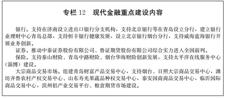 推動(dòng)金融業(yè)務(wù)創(chuàng)新。加快完善金融市場(chǎng)、金融組織、金融產(chǎn)品和服務(wù)模式,更好滿足實(shí)體經(jīng)濟(jì)和人民群眾多樣化的金融需求。鼓勵(lì)利用互聯(lián)網(wǎng)、大數(shù)據(jù)、人工智能等,進(jìn)行金融業(yè)務(wù)流程改造和產(chǎn)品創(chuàng)新。積極發(fā)展養(yǎng)老金融、教育金融、文化金融、旅游金融、農(nóng)村金融等新型金融服務(wù)。規(guī)范發(fā)展互聯(lián)網(wǎng)金融、區(qū)塊鏈、人工智能等領(lǐng)域的新型金融業(yè)態(tài)。支持小額貸款公司、典當(dāng)、融資租賃、商業(yè)保理等金融組織創(chuàng)新、可持續(xù)發(fā)展。統(tǒng)籌發(fā)展介于現(xiàn)貨與期貨之間的大宗商品交易業(yè)務(wù),打造具有全國(guó)影響力的交易場(chǎng)所。支持濟(jì)南推進(jìn)新舊動(dòng)能轉(zhuǎn)換金融創(chuàng)新發(fā)展試點(diǎn),開(kāi)展金融服務(wù)實(shí)體經(jīng)濟(jì)改革創(chuàng)新。支持煙臺(tái)開(kāi)展基金管理服務(wù)專項(xiàng)改革創(chuàng)新,青島建設(shè)財(cái)富管理金融綜合改革試驗(yàn)區(qū)。支持棗莊、臨沂等市開(kāi)展普惠金融改革創(chuàng)新,探索完善區(qū)域普惠金融服務(wù)體系。支持濰坊建設(shè)文化藝術(shù)金融綜合試驗(yàn)區(qū)、德州舉辦京津冀魯資本技術(shù)交易大會(huì)。