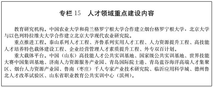 完善人才培養(yǎng)機(jī)制。積極推進(jìn)世界一流大學(xué)和一流學(xué)科建設(shè),爭(zhēng)取國(guó)家支持建設(shè)中國(guó)康復(fù)大學(xué)、中國(guó)能源大學(xué),加快齊魯工業(yè)大學(xué)、齊魯醫(yī)科大學(xué)建設(shè)。實(shí)施新工科優(yōu)先發(fā)展計(jì)劃,增設(shè)面向新經(jīng)濟(jì)、新產(chǎn)業(yè)的學(xué)科專業(yè),建設(shè)新型高端智庫(kù),造就一大批戰(zhàn)略科技人才、科技領(lǐng)軍人才、青年科技人才和高水平創(chuàng)新團(tuán)隊(duì)。鼓勵(lì)本科高校、職業(yè)院校(含技工院校)和培訓(xùn)機(jī)構(gòu)開(kāi)展技術(shù)技能培訓(xùn)、創(chuàng)業(yè)創(chuàng)新培訓(xùn),建設(shè)職業(yè)教育創(chuàng)新發(fā)展試驗(yàn)區(qū),籌建山東創(chuàng)業(yè)大學(xué)。傳承弘揚(yáng)勞模精神、工匠精神,打造知識(shí)型、技能型、創(chuàng)新型勞動(dòng)者大軍。大力倡導(dǎo)企業(yè)家精神,依法保護(hù)企業(yè)家的創(chuàng)新收益和財(cái)產(chǎn)權(quán),培養(yǎng)造就具有戰(zhàn)略思維、國(guó)際視野和勇于創(chuàng)新的企業(yè)家和經(jīng)營(yíng)管理人才隊(duì)伍。